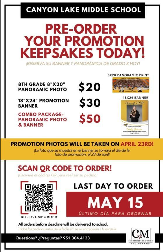 The 8th graders will be taking promotion photos on April 23 during their PE classes. 8th graders will also take an 8th grade panoramic photo duirng period 1 that day.